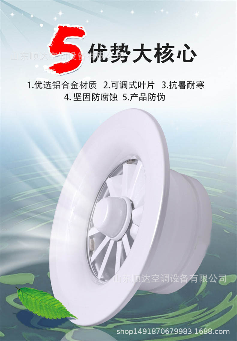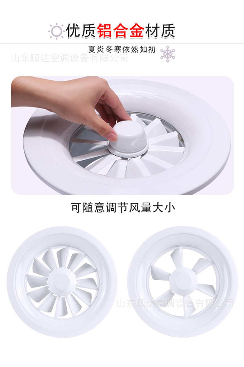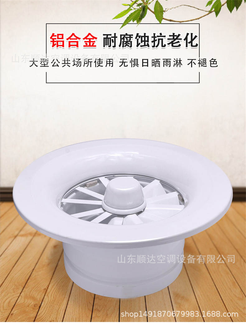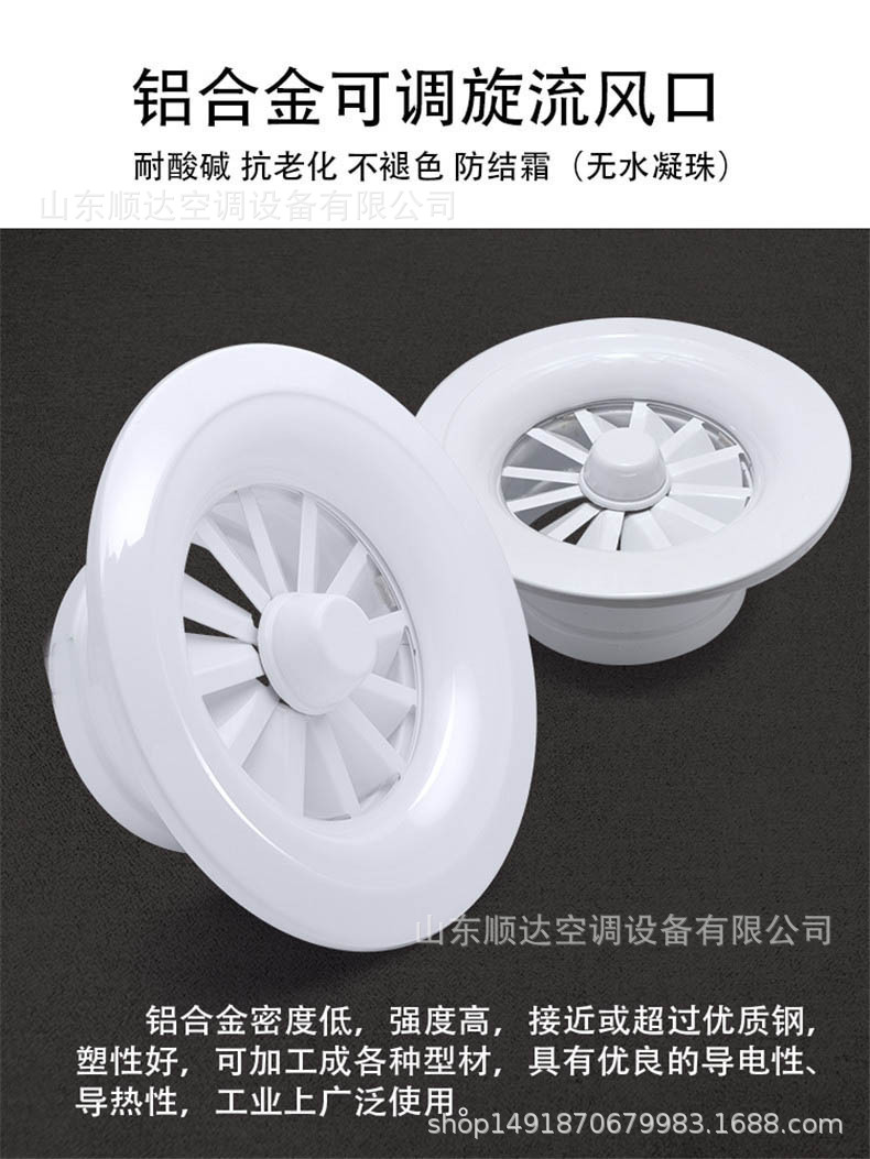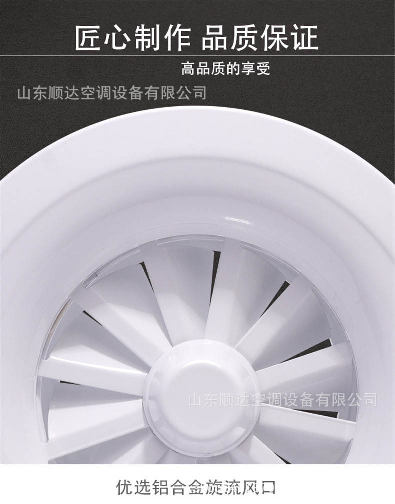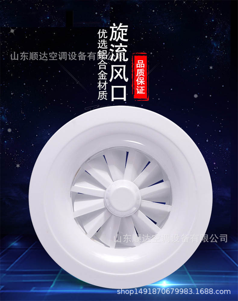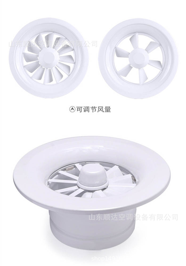 旋流風(fēng)口是空調(diào)系統(tǒng)中的一個(gè)排風(fēng)工具。在空調(diào)通風(fēng)系統(tǒng)中可用作大風(fēng)量,大溫差送風(fēng)以減少風(fēng)口數(shù)量,安裝在天花板或頂棚上,可用于3米以內(nèi)低空間,也可用二種高度大面積送風(fēng),高度甚至可達(dá)10米以上。