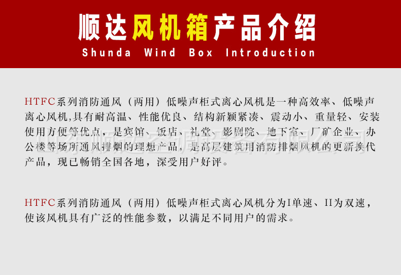 5、風機箱有消防排煙型和通風型兩種類型。消防排煙型采用耐高溫結構板、電動機及傳動部件均安置在風機箱外端,可排放280℃以上的高溫煙氣連續(xù)運行100分鐘以上。